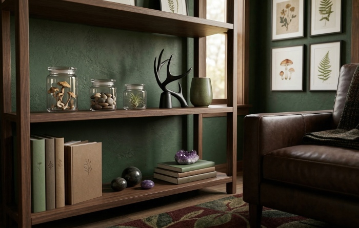 A wilder, less refined cousin of Cottagecore, this aesthetic leans into the genuinely strange and foraged. Dried mushroom specimens, antler finds, river stones on the windowsill, taxidermy that's more curiosity cabinet than hunting lodge. The palette is dark forest: deep greens, charcoal, brown, rust. It's maximalist in a completely unselfconscious way, and it's finding a devoted audience among people who want their homes to feel genuinely lived-in and idiosyncratic.