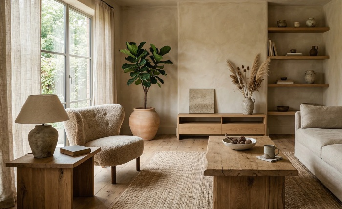 For those who find the trend pendulum too exhausting, Warm Minimalism offers a middle path. It shares Quiet Luxury's commitment to quality materials and clean lines, but trades the polished formality for something earthier and more imperfect — raw linen, wabi-sabi ceramics, plaster walls with visible texture, furniture that's simple but clearly handmade. It's minimalism with soul: fewer things, but things that matter, in spaces that feel genuinely human.