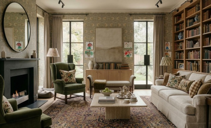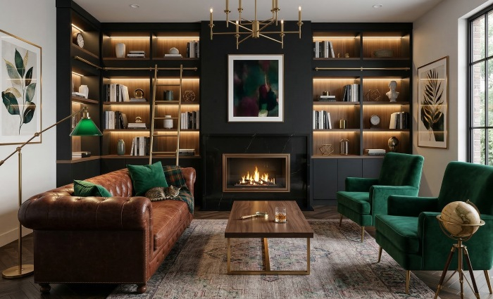 Moody, intellectual, and deeply romantic, the Dark Academia home is built around the idea of a life lived among ideas. Think dark-stained wood paneling, emerald or oxblood velvet upholstery, brass library lamps, globes, and walls lined floor to ceiling with books. There's a theatrical quality to it — every room feels like a scene from a novel — but done well, it produces spaces of genuine warmth and depth. The fireplace is non-negotiable.