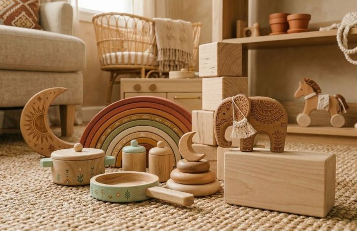 Walk into any well-designed nursery on Pinterest or Instagram right now, and you'll notice something. Alongside the linen curtains, the rattan baskets, and the carefully chosen color palette — there are wooden toys. Not plastic dinosaurs or light-up gadgets, but smooth, simple, beautifully crafted wooden pieces. A stacking rainbow on the bookshelf. A set of natural blocks on the rug. A little wooden kitchen in the corner.