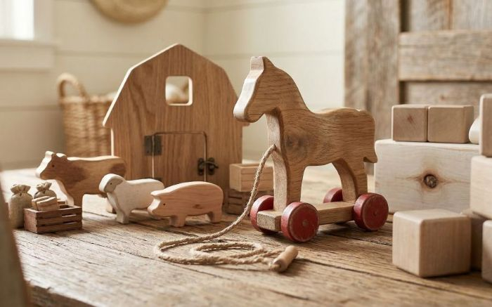 Modern Farmhouse — The Joanna Gaines aesthetic is still going strong in homes. Shiplap walls, neutral palettes, and a mix of rustic and refined elements. Wooden toys in natural finishes — especially anything with a vintage or nostalgic feel, like a classic wooden pull toy or a handcrafted barn set — feel perfectly placed here.
